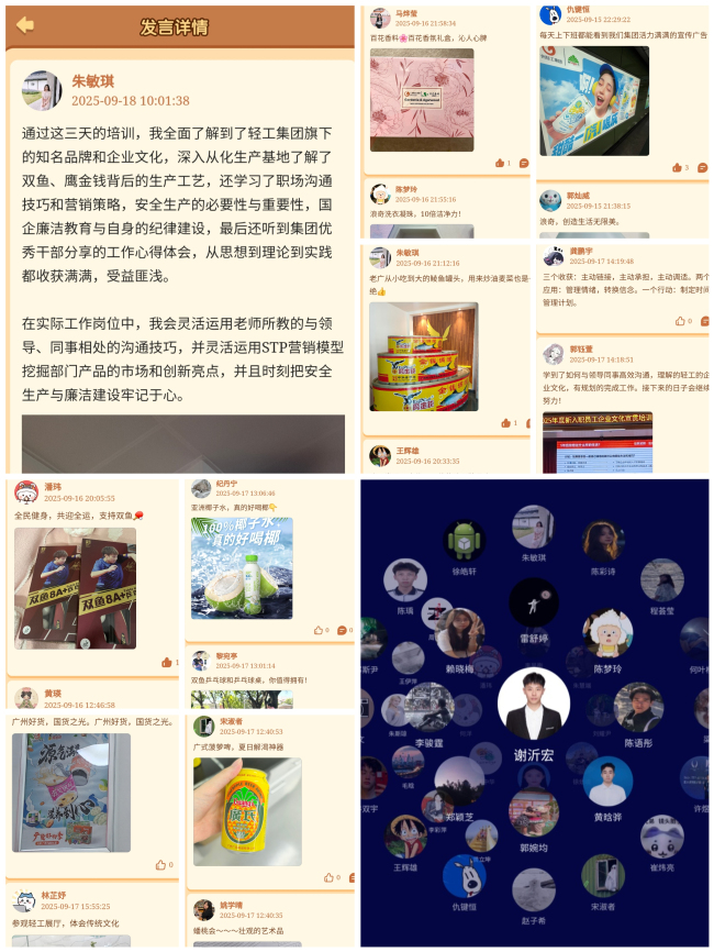 为融入Z世代数字化潮流,本次新入职员工培训班量身打造“轻工小镇”小程序,以数字化手段完成快速破冰、团队组建和过程管理,帮助新入职员工更好融入课堂,完成从个体参与者到团队协作者的角色融入,踊跃分享课堂所学所悟及与轻工品牌产品的点滴趣事,获得广泛好评。